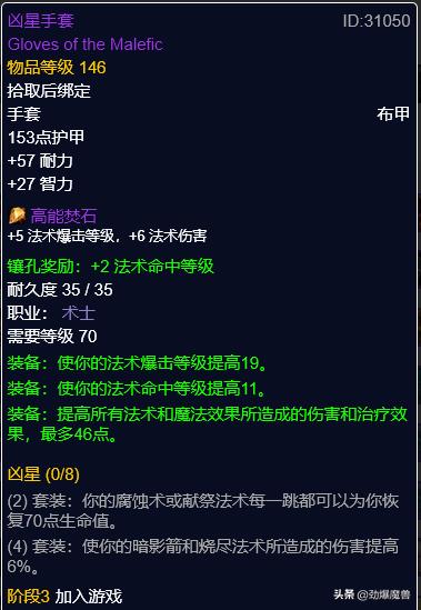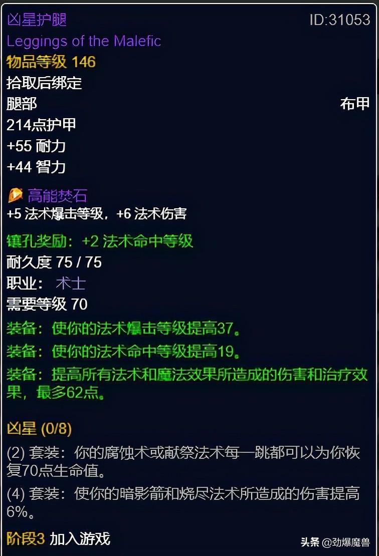 下面就参考WCL上的术士大佬配装以及一些装备的个人感觉给大家提供一些P3阶段术士的装备选择的参考推荐。