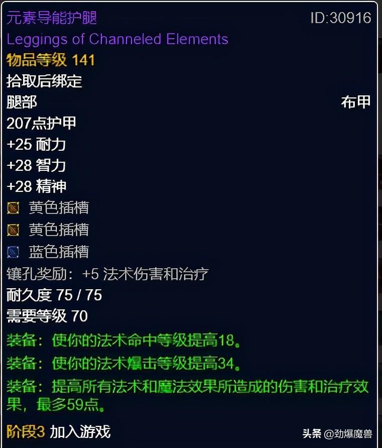 元素导能护腿,卡兹洛加掉落。两黄一蓝三插孔,奖励5法伤,智力、精神属性。