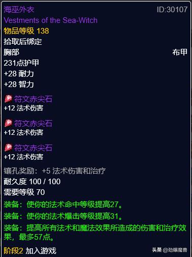 海巫外衣,毒蛇神殿瓦丝琪掉落。两黄一蓝三插孔,奖励5点法伤。