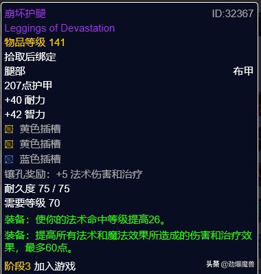 崩坏护腿,莎赫拉丝主母掉落。两黄一蓝三插孔,奖励5法伤,高命中属性。