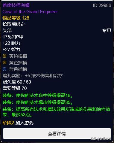 首席技师兜帽,风暴要塞空灵机甲掉落。两黄一篮三插孔,奖励5点法伤,暴击、命中属性。