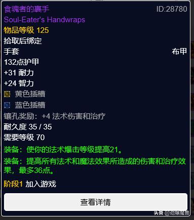 食魂者的裹手,玛瑟里顿掉落。黄蓝双孔,奖励4点法伤。