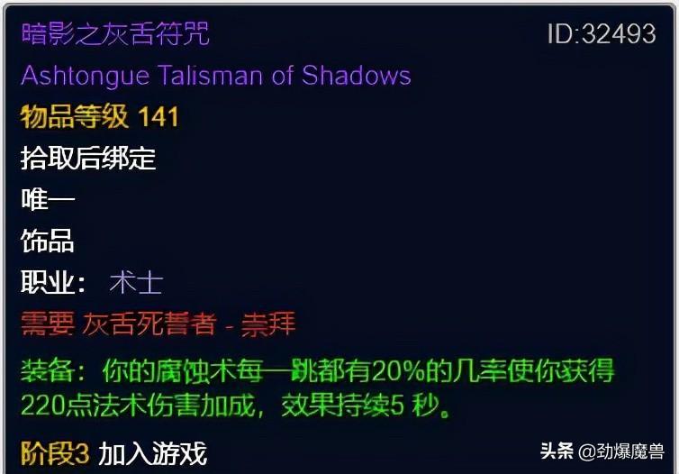 暗影之灰舌符咒,黑暗神殿声望获取。腐蚀术触发法伤加成。