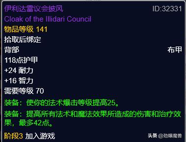 伊利达雷议会披风,伊利达雷议会掉落。智力、暴击、法术伤害属性。