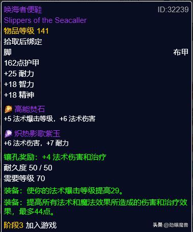 唤海者便鞋,高阶督军纳因图斯掉落。智力、精神属性,蓝黄双孔,奖励4点法伤。