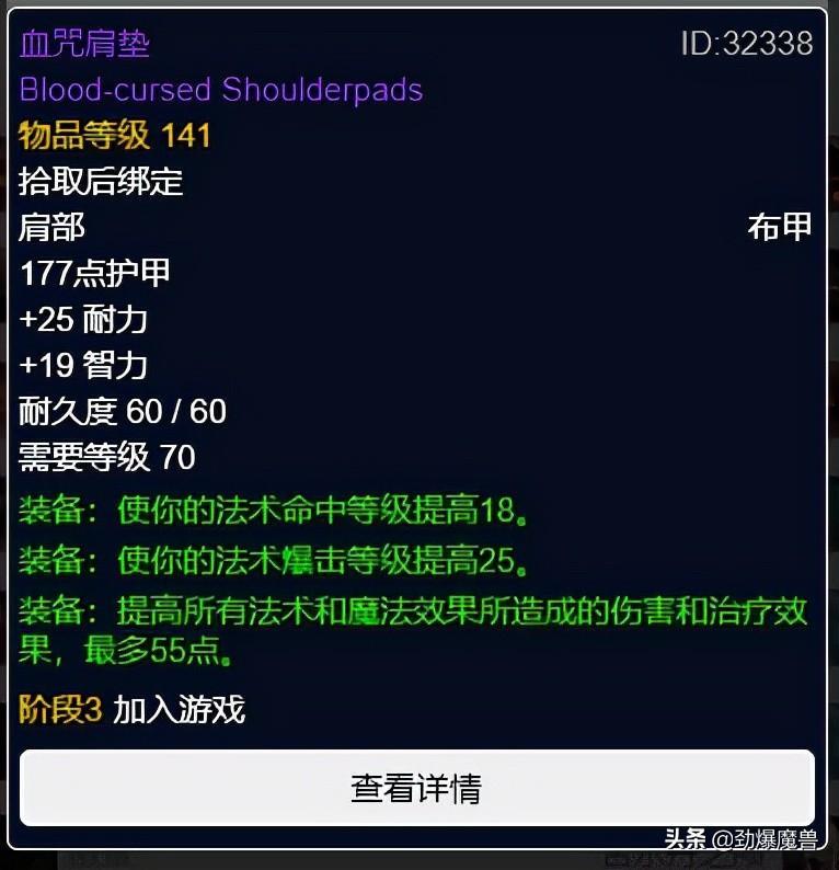 肩部还是首选T6肩膀,在没有T6肩的时候可以选着血咒垫肩进行过渡,命中有溢出时可以选敏锐思维衬肩堆叠急速。怨怒护肩是一个比较特殊的装备,可以选择在特定的boss战的时候换上使用,法穿属性在特定的时候还是比较好的。