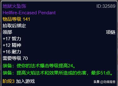 狱火坠饰,海加尔峰小怪掉落。智力、精神基础属性,暴击和火焰法术伤害加成。