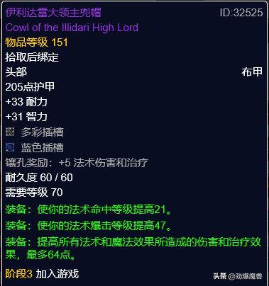 伊利达雷大领主兜帽,伊利丹掉落。蓝色插孔,奖励5点法伤,高暴击属性。