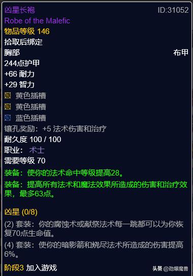 凶星长袍(T6),伊利丹掉落。两黄一蓝三插孔,奖励5点法伤。