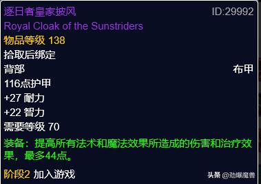 逐日皇家披风,风暴要塞王子掉落。高智力属性,高法术伤害属性。