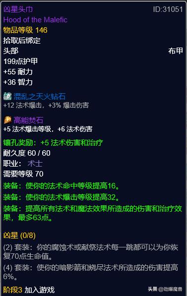 凶星头巾(T6),阿克蒙德掉落。黄色插孔,奖励5点法伤,暴击、命中属性。