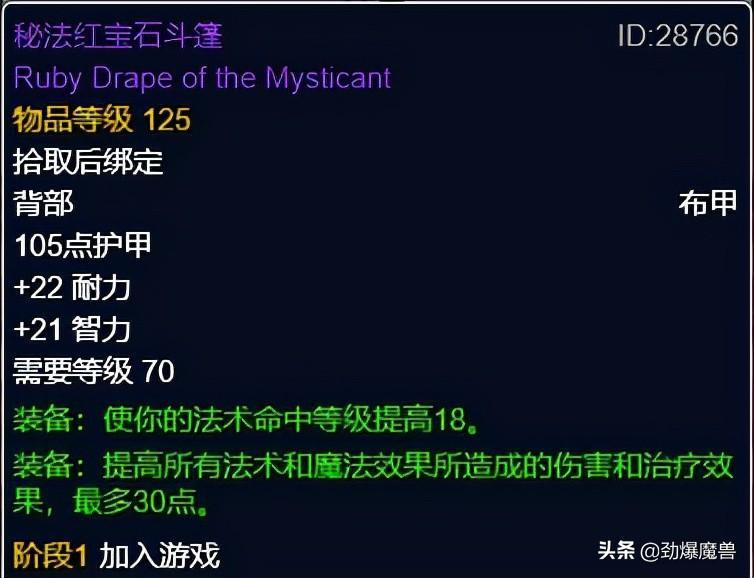 秘法红宝石斗篷,卡拉赞王子掉落。高智力属性,命中、法术伤害属性。