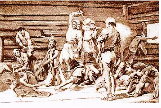 印第安人被分别带入小屋,男人一屋,妇孺一屋,被乱棒活活打死,然后又被剥下头皮。简言之,100个印度人中就有96个被剥去头皮杀死,整个村庄被付之一炬。一名幸存者躲进树林里,而实际上还有人躲过了剥皮,逃跑去警告周围的村庄。