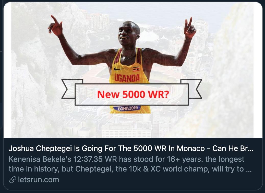 这一成绩也让他坚定了打破场地5000米的信心。摩纳哥也似乎成了切普特盖的福地。