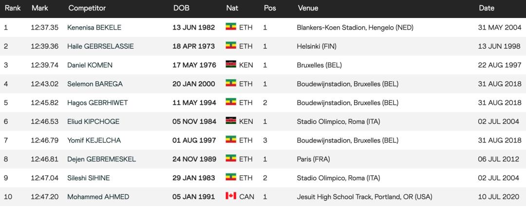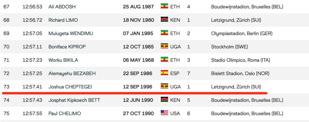而今天切普特盖将自己的5000米PB,提高了22秒,超越贝克勒,荣登榜首!