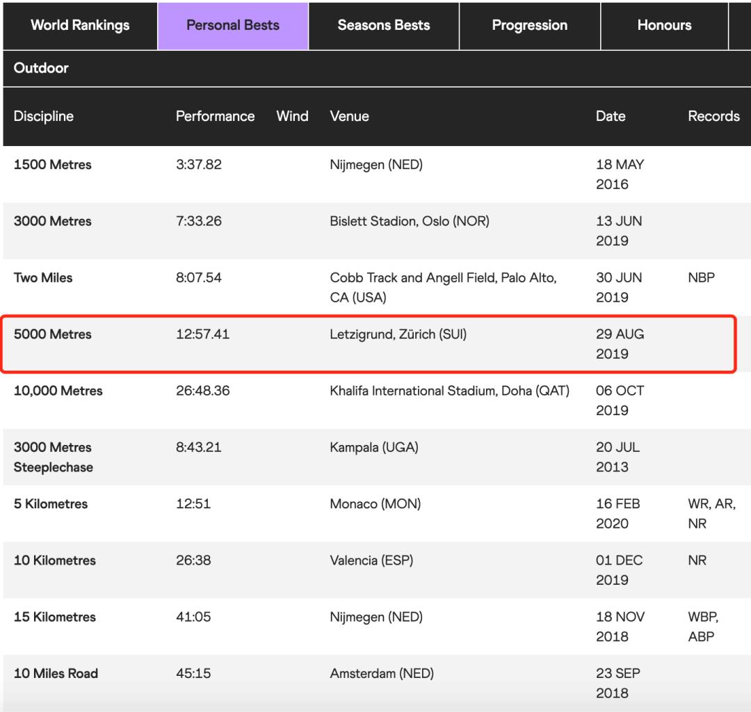 场地5000米最好成绩是2019年8月29日跑出的12分57秒41,这一成绩此前在5000米历史最好成绩中排名第73位。