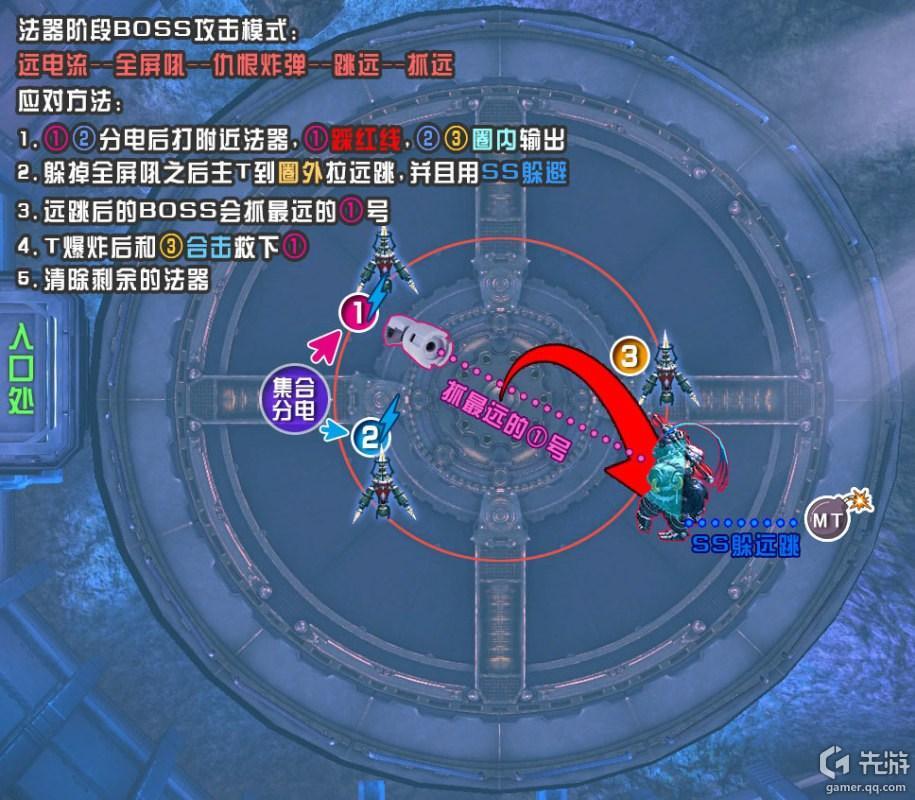 主T拉到炸弹之后往外走,不要扎到1、2号,但是又不能比3号远,让Boss第一跳跳最远的3号