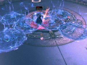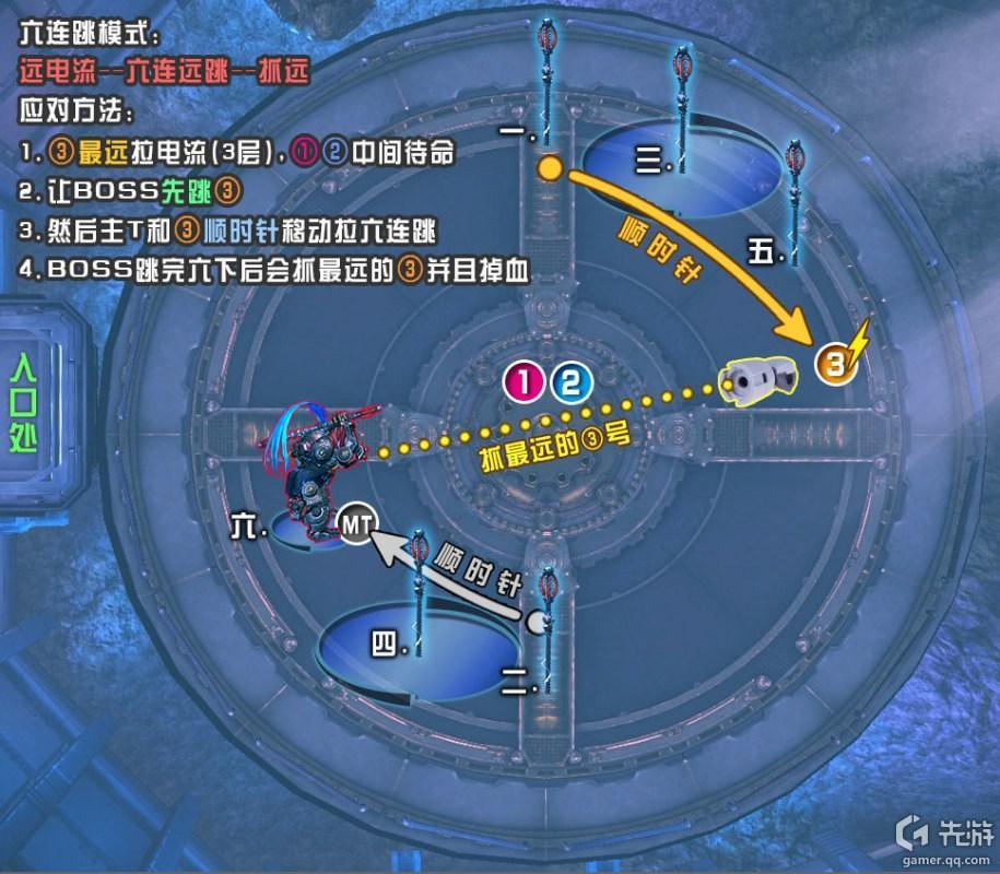 六跳完毕,Boss会伸出电流锁链抓3号,但是由于3号身上有超电流导致电流逆流到Boss身上而掉血