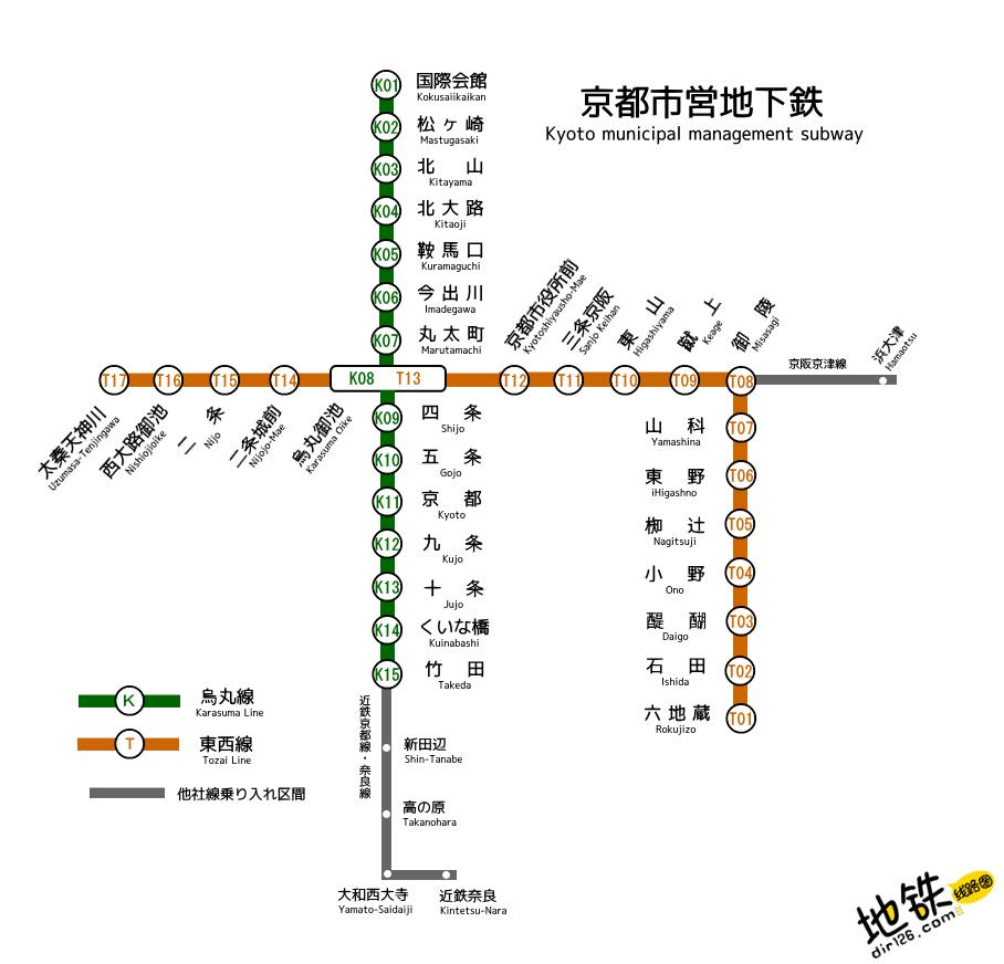 日本京都市营地铁乌丸线:国际会馆→松崎→北山→北大路→鞍马口→今出川→丸太町→乌丸御池→四条→五条→京都→九条→十条→水鸡桥→竹田