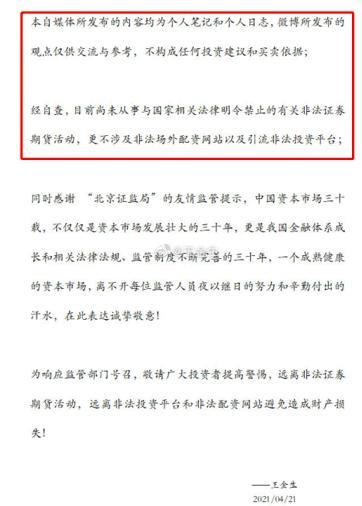 “王金生”发微博回应称,“本自媒体发布的内容均为个人笔记和个人日志,微博所发布的观点仅供交流与参考,不构成任何投资建议和买卖依据;经自查,目前尚未从事与国家相关法律明令禁止的有关非法证券期货活动,更不涉及非法场外配资网站以及非法投资平台。”