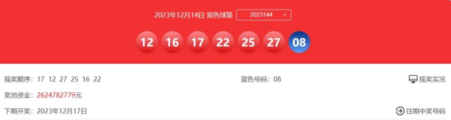 12月14日,福彩双色球第2023144期开奖,同时本期还是双色球12亿大派奖的第16期开奖。本期开奖号码:红球12 16 17 22 25 27,蓝球08。