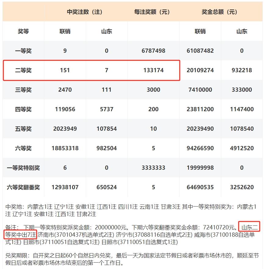 山东喜获7注二等奖