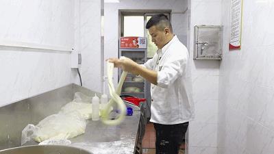在窗口即可看到厨师现场拉面,经过三下五除二熟练地将面团拉成细长的面条。整个过程犹如一场表演,看着都过瘾。