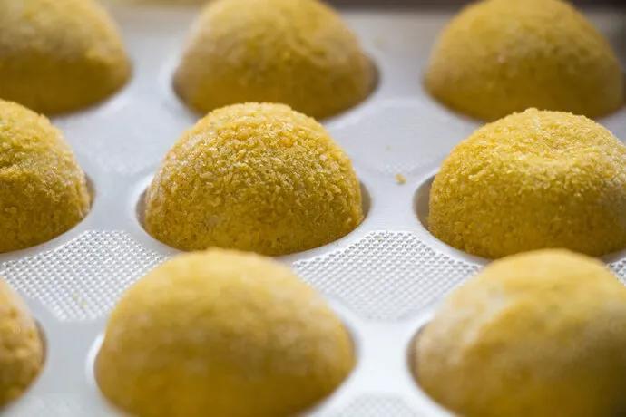3.搓成小丸子,放进热油锅里油炸,翻动、炸香(炸金黄,炸香脆)