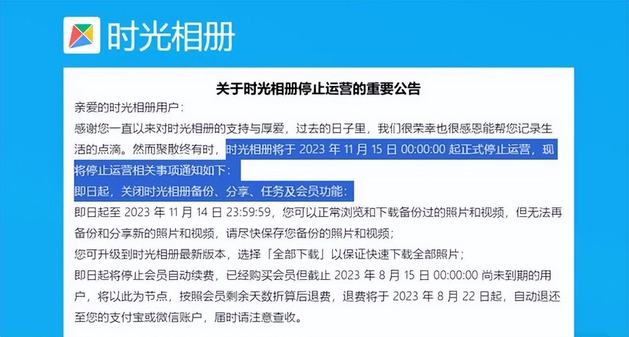 近日,那个被称为"永不消逝的记忆"的APP—时光相册,对外宣布下线了。据字节跳动旗下时光相册官方发布的公告称,2023年11月15日00:00:00起,时光相册正式停止运营。目前,已关闭时光相册备份、分享、任务及会员功能。
