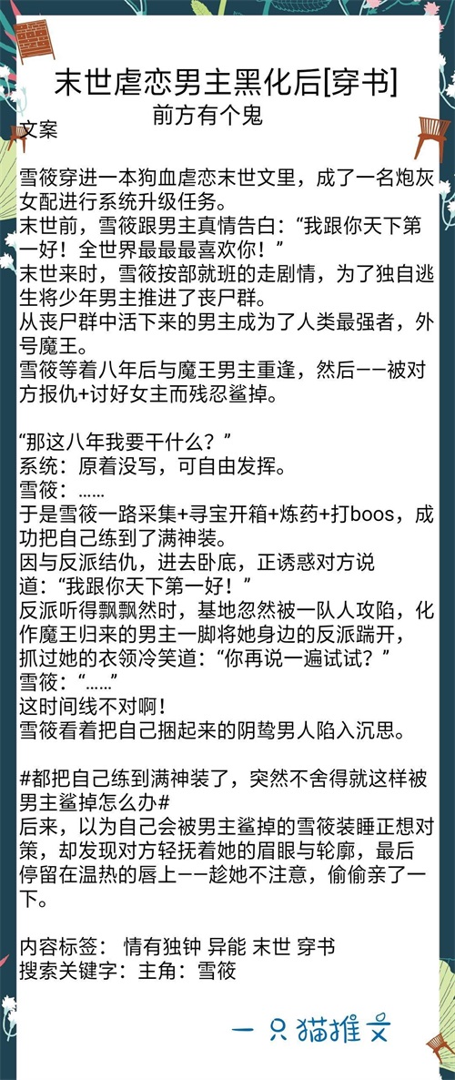 女主穿书末世文,里面的反派大佬体质特殊,别人谁碰到他谁死。系统给了女主一个金手指,她是唯一一个可以触碰大佬的人,大佬收了她,却也因此怀疑她的身份。女主原本一心傍着大佬,只想完成任务回家。后来,发现大佬手段恶劣狠毒且对她有了杀心,她不得不逃跑,开始绝境求生的日子。剧情推进快有反转,很好看的。男主是个白切黑的伪白莲。女主是个表面没皮没脸,实际上机智得一批的小可爱。