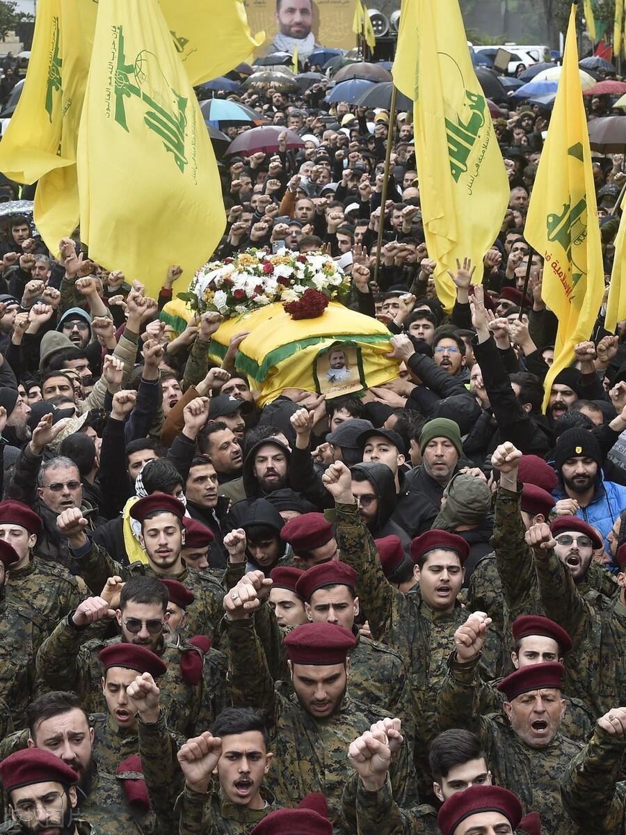 当地时间2024年2月16日,黎巴嫩南部纳巴蒂耶,遭袭身亡的黎巴嫩真主党指挥官葬礼举行