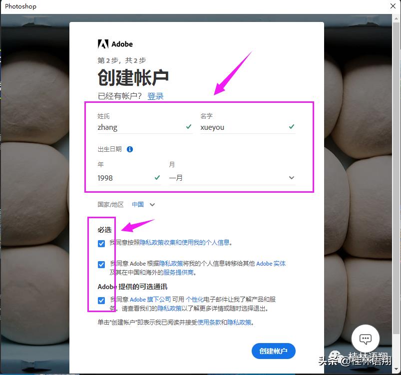 点击“继续”之后,进入如下界面。输入自己的姓氏、名字、出生年份和月份,这4项可以随便填写,无需填写自己的真实信息。再确认勾选下面的3个必选项,点击右下角的“创建账户”。稍等片刻,你就拥有一个属于自己的Adobe账户了。