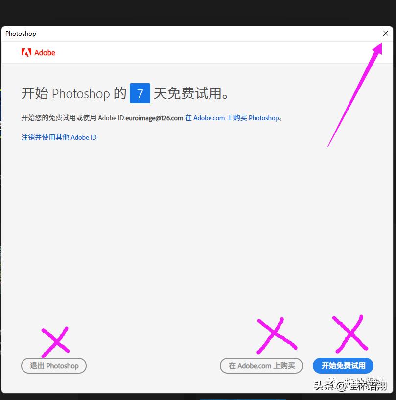 这时候,不要点击界面下方的“退出Photoshop”、“在Adobe.com上购买”或“开始免费试用”,点击右上角的“X”关闭,然后退出PS。