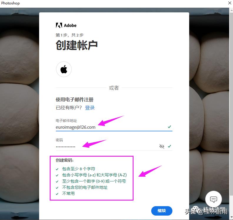 在弹出的“创建账户”界面中,输入你的电子邮件地址、设置你的登录密码,点击右下角的“继续”。