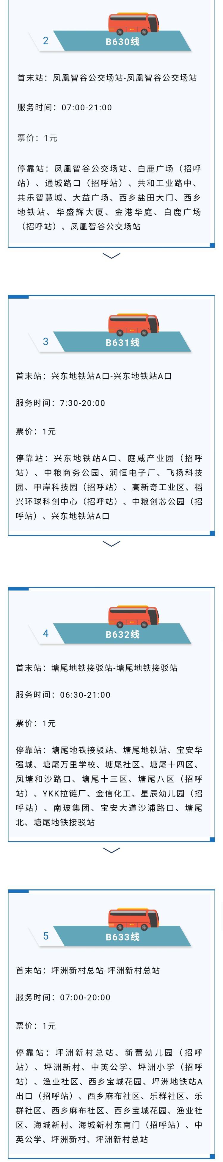 据介绍,4条接驳巴士分别为B630线(凤凰智谷公交场站-凤凰智谷公交场站)、B631线(兴东地铁站A口-兴东地铁站A口)、B632线(塘尾地铁接驳站-塘尾地铁接驳站)和B633线(坪洲新村总站-坪洲新村总站)。