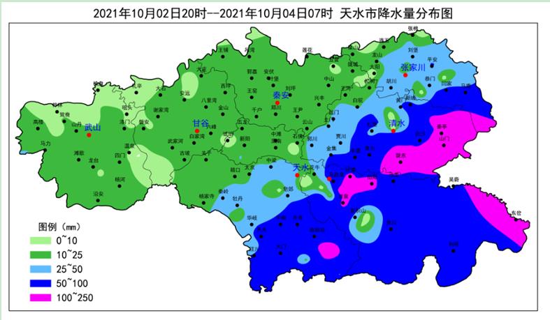 受北部冷空气和高原暖湿气流共同影响,10月2日夜间开始,天水市出现大范围降水天气,降水期间伴有雷电,清水县和麦积区18个站点出现短时强降水,最大小时雨强41.0毫米,出现在麦积东岔镇。截止4日07时,秦州南部、张家川东南部、清水中东部和麦积东部73个站点雨量超过50毫米,20个站点雨量超过100毫米,累积最大降水出现在清水秦亭镇店子,达147.1毫米。受降水影响中东部乡镇发生中小河流洪水、山洪、滑坡、泥石流等次生灾害的气象风险高。