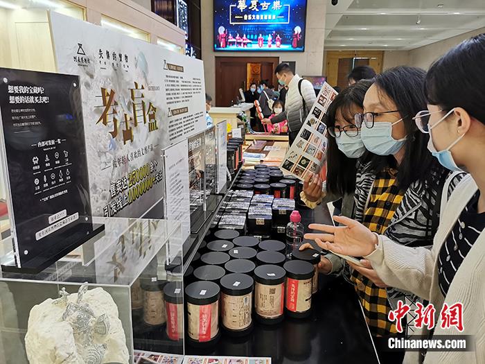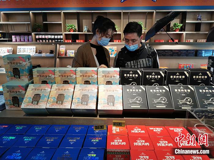 图为10月6日,河南博物院的文创商品销售区,参观者选购考古盲盒。 中新社记者 韩章云 摄
