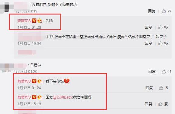 而看到这条动态的网友也是被逗笑了,蔡萝莉这波还真暴露不懂日常生活。事实上蒸饺这玩意大家都清楚,用的不就是肥肉加瘦肉,加肥肉的目的是为了让其出油变成汁,这样更加美味。而这些也是一些普通人的常识,只要平日里做过饭甚至稍微接触一点的人都清楚。