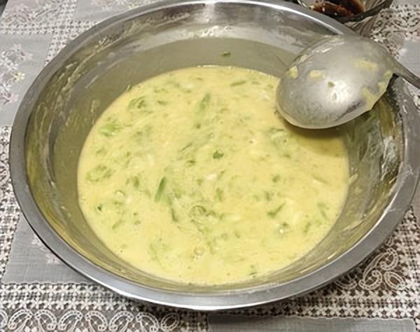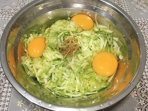 西葫芦擦丝,打入3个鸡蛋,加入葱末,五香粉和一勺盐,