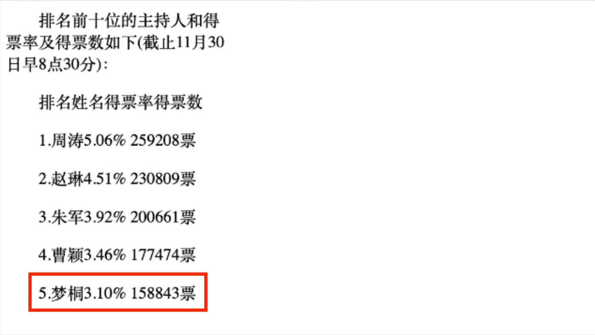 第一名是门面担当周涛,而梦桐也备受观众喜爱,位居第五。