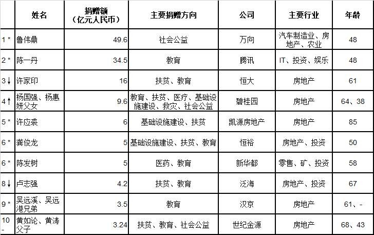 首善鲁伟鼎成为历年来第14位单笔捐赠超过10亿的慈善家,他以慈善目的捐出其持有的万向三农全部股权,设立鲁冠球三农扶志基金慈善信托,此信托间接持有万向德农、河北承德露露和航民股份三家上市公司的股权,依照去年10月9日收盘价计算,市值49.6亿元;陈一丹以35亿元捐赠额排名第二,主要包括捐赠腾讯股票成立慈善信托,价值34亿元;许家印捐赠16亿元排名第三,主要包括向家乡周口捐赠6.5亿元支持其发展,目前到账2.1亿元,向广东扶贫济困日捐赠5亿元等。