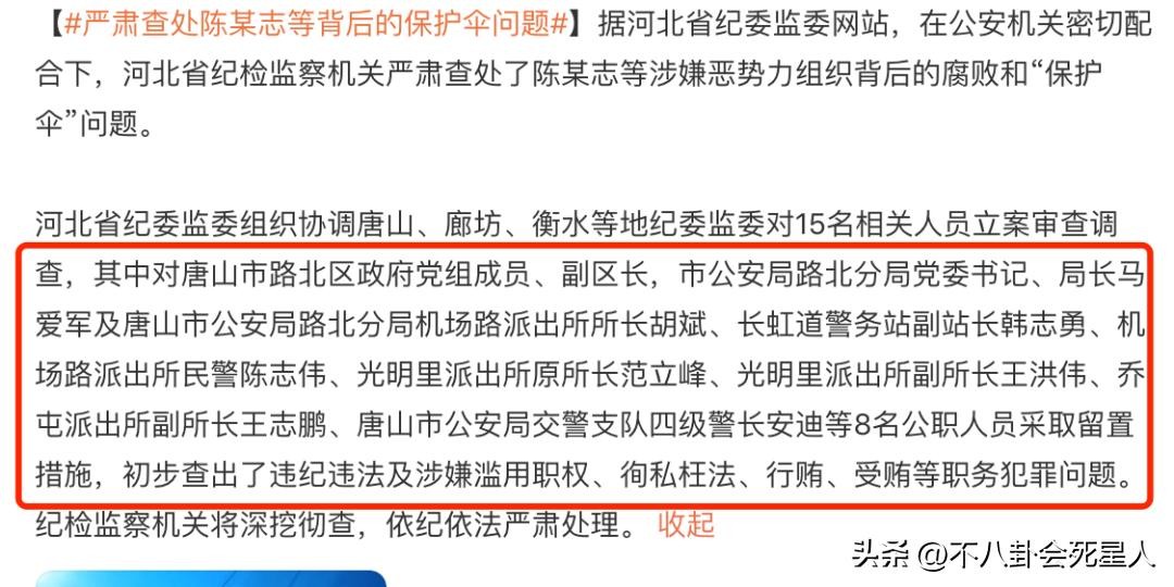在此次调查中,唐山市公安局局长、唐山市机场路派出所所长、警务站副站长等8位公职人员,初步查出了违纪违法及涉嫌滥用职权、徇私枉法、行贿、受贿等职务犯罪问题。