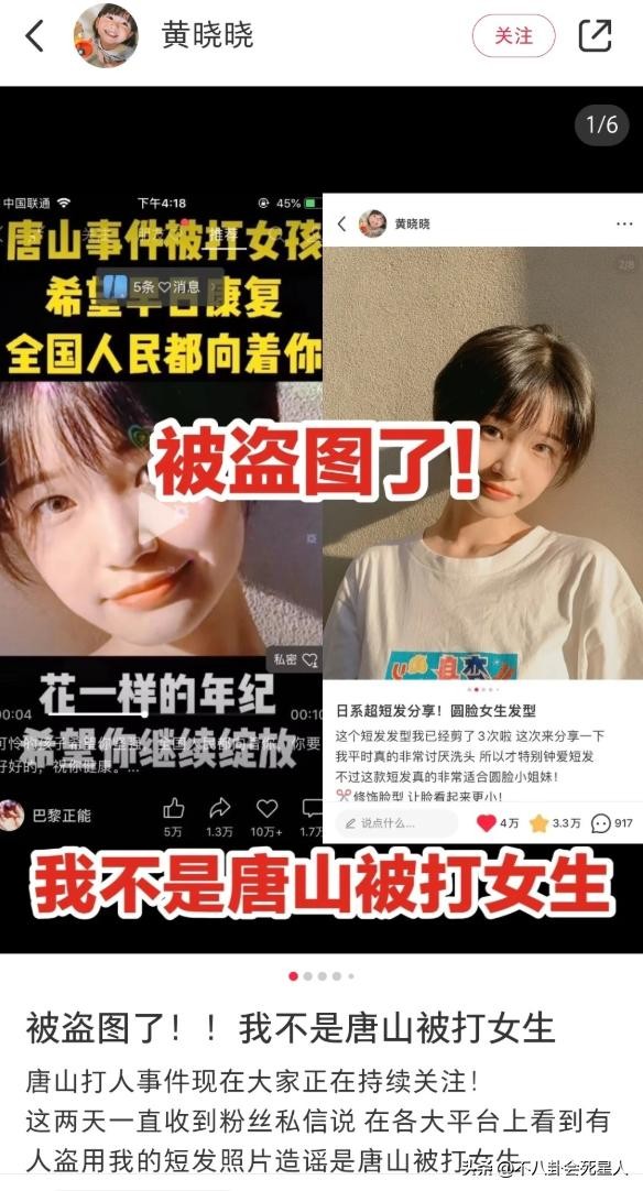 其三,唐山事件刚爆发几天后,就有所谓的“受害者女孩照片曝光”,还做了受伤前后的对比图。但之后该短发女生澄清,是自己的照片被盗用,并不是受害者女孩。