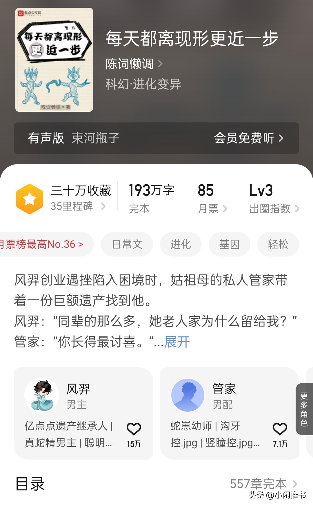 这本书适合慢慢看,前几十章非常罕见,写的十分不错,练功升级的爽点非常棒,阴天神隐设计了一个生物改造+魔药+功法杂糅的升级体系,设定十分有新意。如果喜欢看这种节奏不疾不徐的文章,这本书是一个不错的选择!