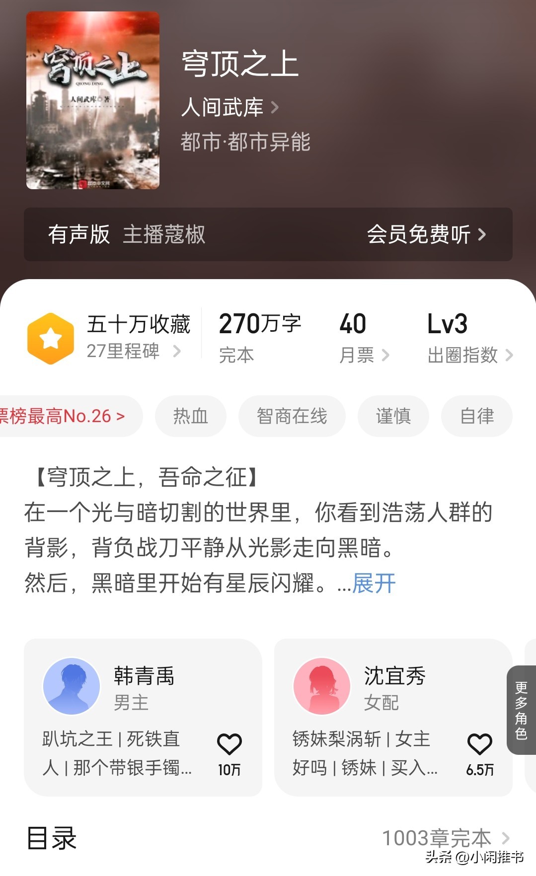 题材相对冷门,的确是难得一见的佳作。前期仙草,开篇五十章代入感很强。设定新颖,水准之上的文笔,尚能自洽的逻辑。缺点:剧情较为简单,可以视作变相的军旅文,所以感情起伏比较大,不一定都能引起共鸣。