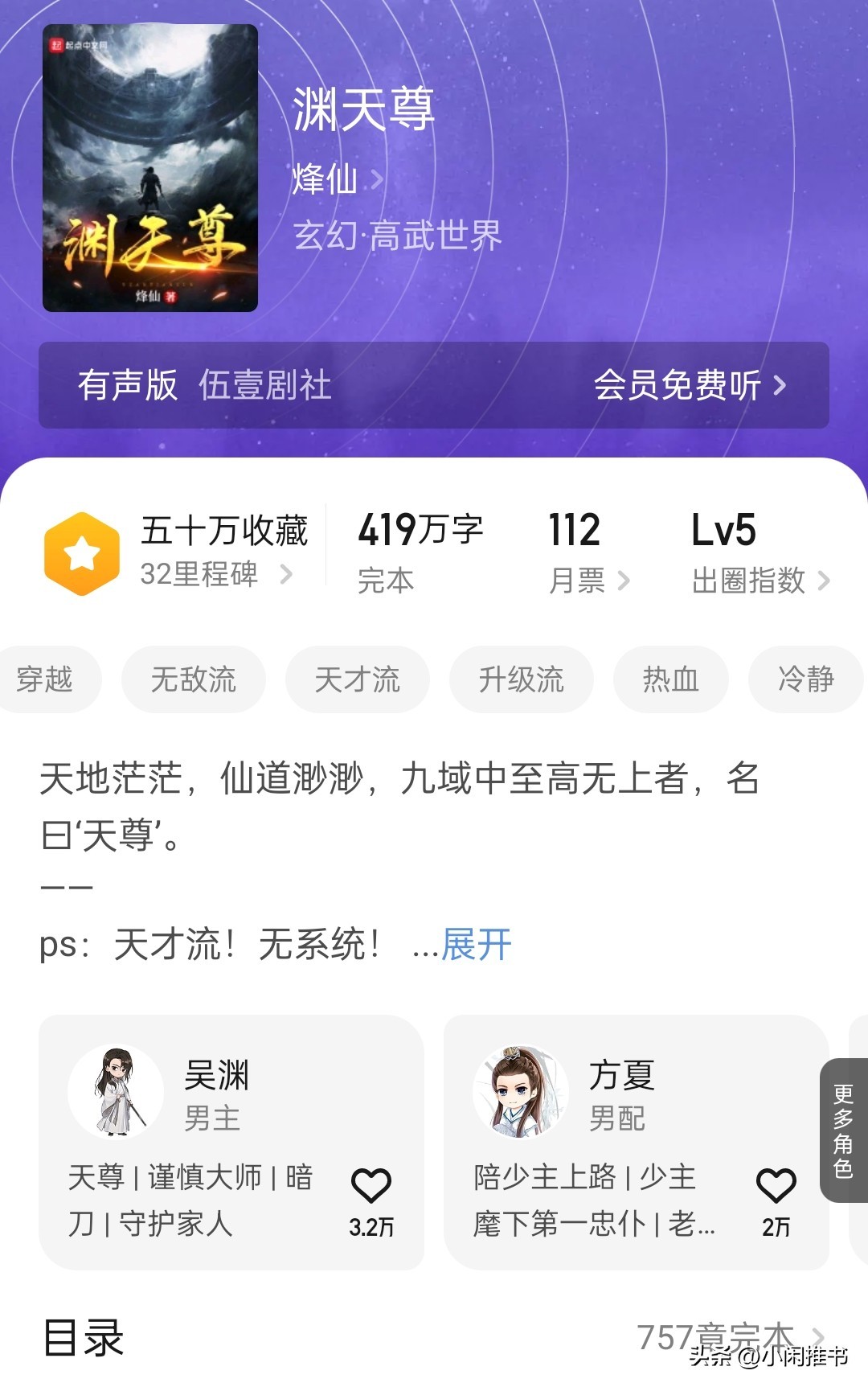 烽仙的仙侠小说的巅峰之作,有非常精彩的故事情节,在闯天骄塔等环节中的表现,展现了他的智慧和勇气。在读者中的口碑很好。如果你是喜欢仙侠题材的书友,那么《渊天尊》绝对是一个不错的选择。它不仅有丰富的内容,还有足够长的篇幅,可以让你尽情沉浸其中。