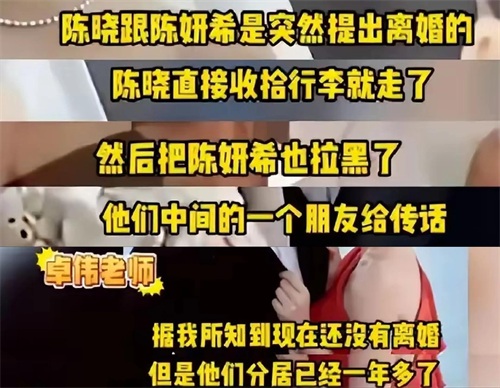 2023年底,陈晓单方面提出离婚并“净身出户”,拉黑陈妍希所有联系方式,仅通过工作人员沟通。