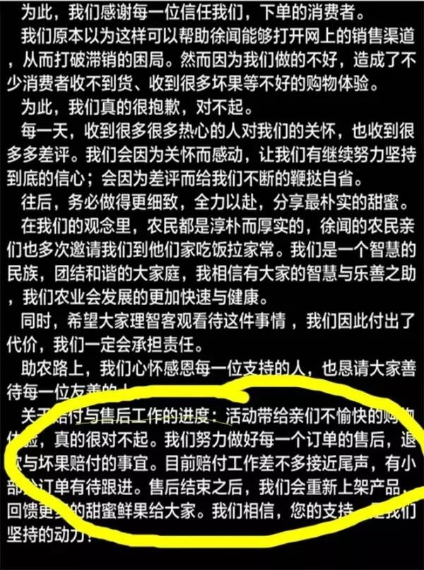 就在媒体大众持续关注中,20日,该网店又贴出一份新公告,称是店家自身做得不好,才造成不少消费者不好的购物体验,农民还是淳朴的,店家会在做完售后赔付工作后重新上架新产品。