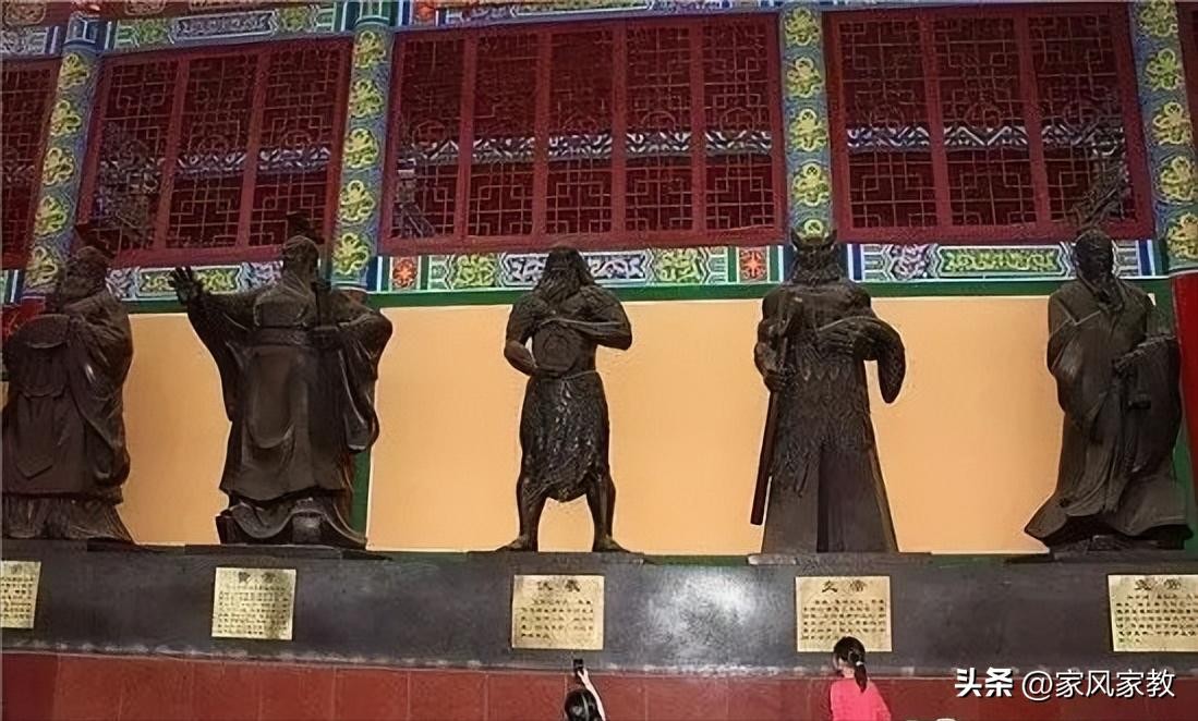 乾坤殿内安放的盘古、伏羲、炎帝、尧、舜六尊铜像,雍容庄严