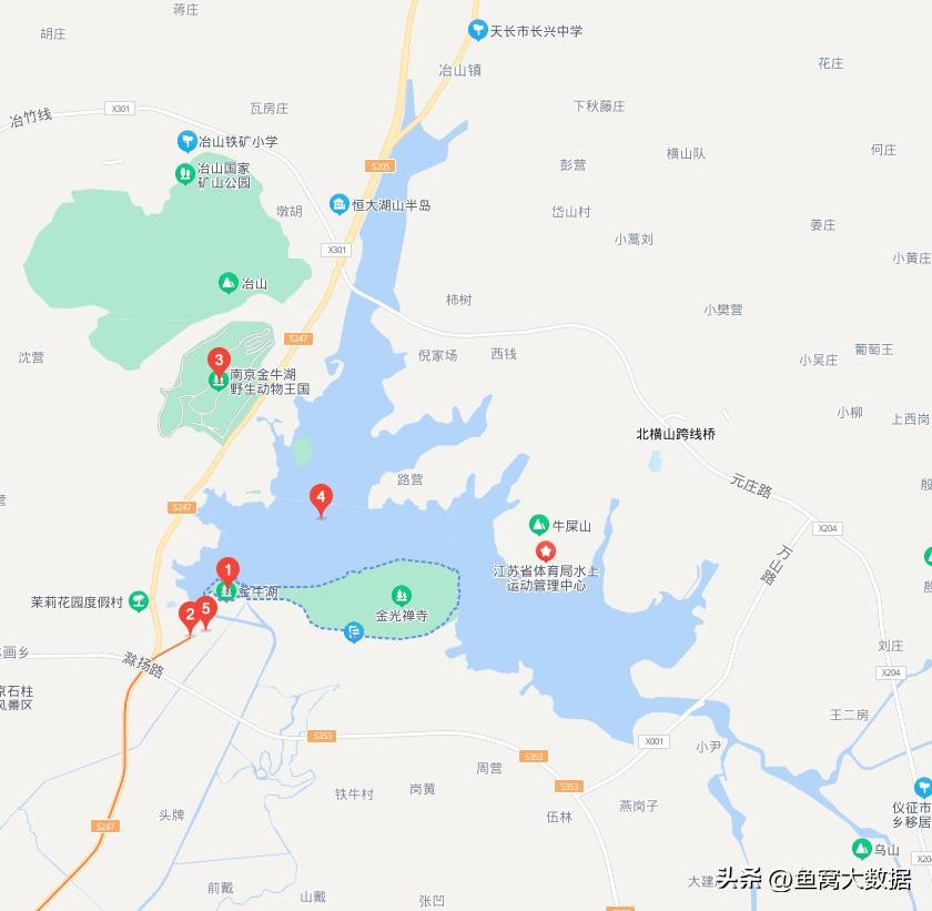 我们可以看到金牛湖不仅水域面积大,而且依山而建,水域很不规则,这种水域是比较难打鱼的,一般是打鲢鳙等上层鱼。中下层鱼、底层鱼一般是不打的,主要是不好打鱼。
